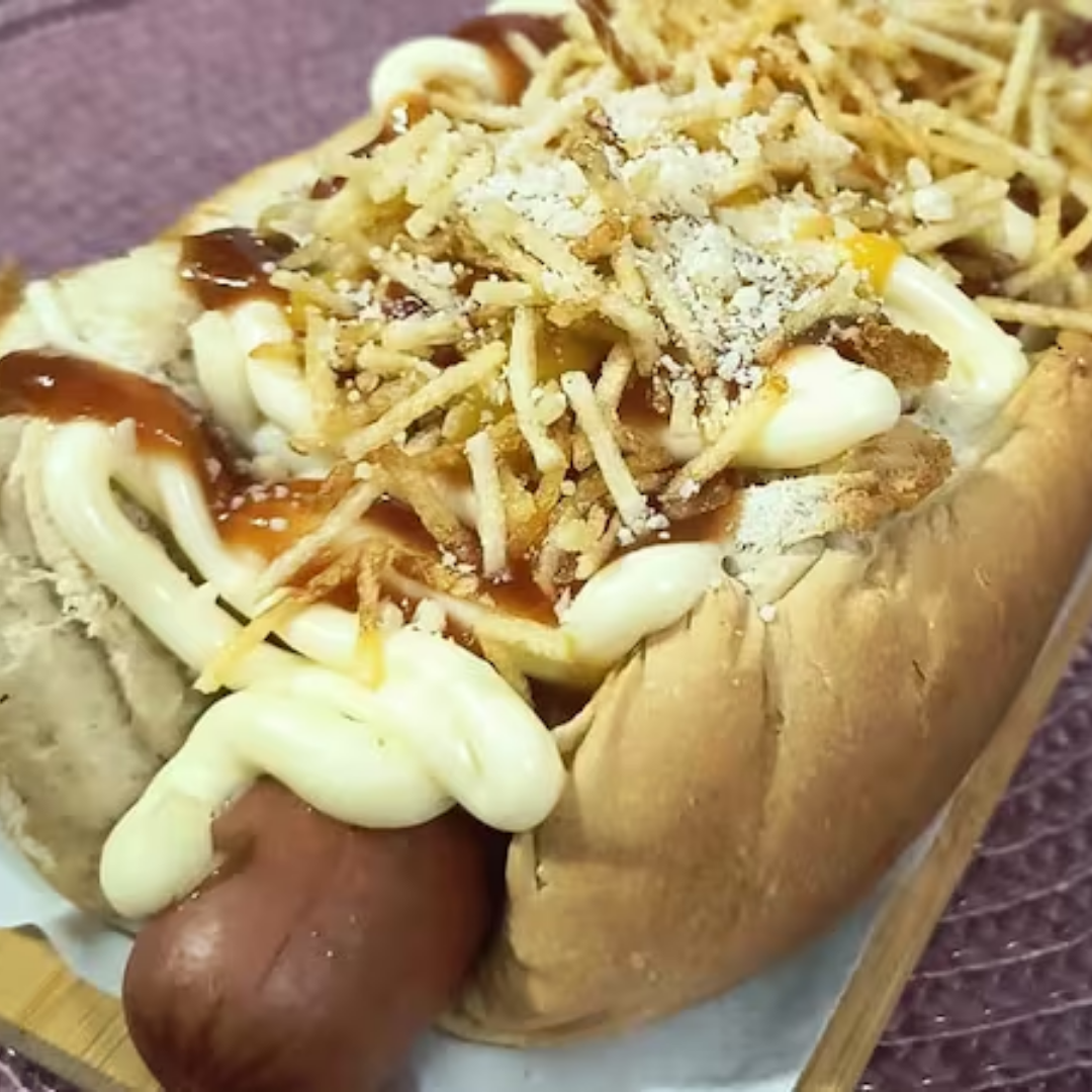 Pão Brioche ou Parmesão(aprox 27cm), 04 Salsichas defumadas ( aprox 14 cm cada uma), Pure de batatas com creme de leite, Catupiry, Cheddar, Milho verde, Ervilhas, vinagrete, Azeitona, Palmito,Queijo Mussarela derretido, Maionese, Mostarda, Ketchup, Batata palha.